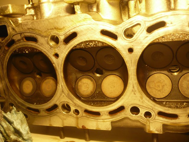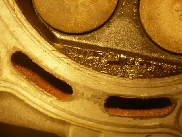 The car has a stock bottom end. N1 oil and water pump, metal H/G, single turbo - gt4088r. The car was being tuned at shop. During the first run, I heard metal noise (sort of broken metal pieces in a can)around the valve cover,tuner shut the car off immediately, I took the valve cover off did not see anything. Decided to tear it down to avoid further damage. Brought the car home, engine out and head removed, I noticed metal debris inside the headers when removing it. Turbo spins fine nothing in there. When I removed the head, here is what I found. Pretty much on every cylinder, more on 2,3,4,5. anyone seen this before?