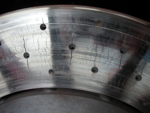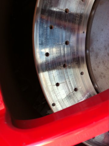 6. Mike, I have a few friends that run the HPDE days here at Sebring, Road Atlanta, etc in their Porsches and say the exact same thing. I heard that guys who run REALLY hard have to change brakes at 5-6 track days! Yikes!! Here is a Porsche that had some of the issues you stated. A rotor failure is a scary thing to even think about. There were 2 Corvette ZR1s and a Ferrari California running there on the Carbon brakes, which is just crazy! From what I heard, the Ferrari rotors are $6k each, so right in line with what you said. The pair of Nissan GTRs were running cast iron rotors, so they are being smart about it. Here is a picture of a stupid set of drilled rotors on a car running at Sebring! As to this very issue, I am offering to treat (Thermal Cycle) a set of rotors and pads for you at No Charge! We just started a new division to do automotive performance and racing parts at: www.thermalmetals.com which is licensed partner of www.thermaltechnologyservices.com here in Florida. We now have facilities in Michigan, Canada, Poland, Germany, Australia and so on. The owner of the company & inventor will guarantee (in writing) that you will see a minimum of 2.5 times the life of the rotor. As a result in treating both the rotor and pad, you should expect to see twice the life of the pad, along with a reduction in brake fade, dust, squeal and stopping distances. We treated a set of brakes on a Porsche powered CanAm car that was run in a 24 hour race that would have to swap out standard rotors after 10 hours....with treated rotors, they went the whole 24 hours! We aren't going to do any advertising, just treat some sets for hardcore track day guys and racers, then let the results speak for themselves. Locally, we are doing a couple Porsches, a Panoz GT racer and a few other high end sports cars. We have also seen an improvement in treating the carbon rotors, but demand for that will be minimal. Once we get enough verified results over the next couple months from guys running them, we are looking at selling the slotted, treated rotors for Porsches and other performance vehicles close to the same price that the sell them for now from those other guys. This will be good for everyone who actually runs their sports cars on the track, not so much those guys who never even get the brakes hot on their Porsche, Ferrari, Lambo, etc.