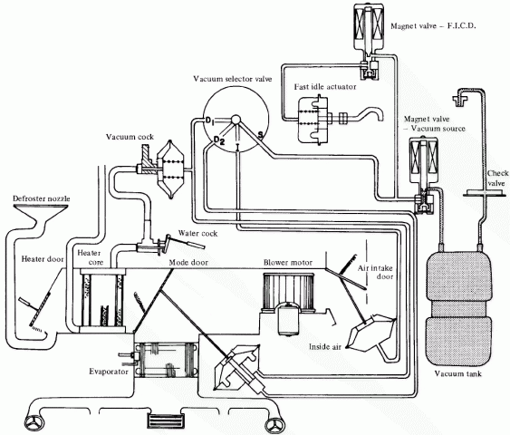 According to the image URL, this is a diagram of a 75 Image downloaded from http://www.atlanticz.ca/zclub/techtips/vacuumlines/ and rehosted here for longevity One solenoid controls AC fast idle (the plunger on your intake manifold, if you still have it), and the other seems to control on/off for the whole climate control system, I'm not sure what triggers that (maybe blower switch? I have to check a diagram) The vacuum heater valve everyone is referencing is the "Vacuum cock" on this diagram, which is basically there to make sure you don't run the heater and AC at the same time.