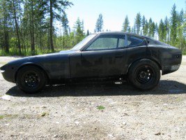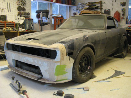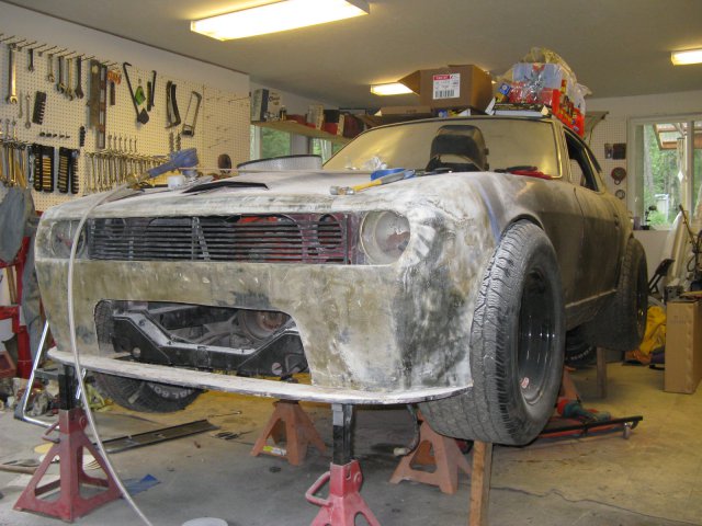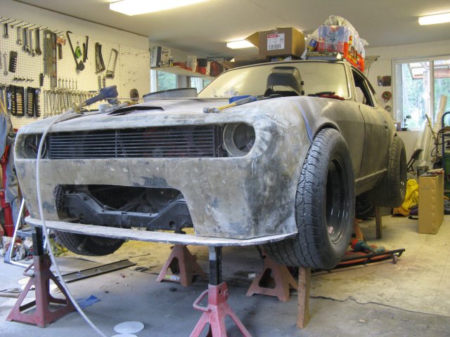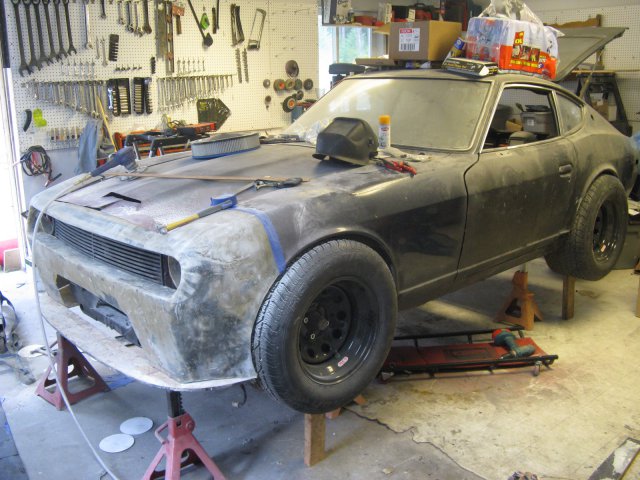 I apologize for not keeping up with the build I have rebuilt the front many times because of flaws and now I am finally fiberglassing. This project is way more work then I thought it was going to be almost gave up many times and went back to the original z front end, but luckily I threw It all away( to keep me from going back). with the work it has taken and how hard it is for me to work with this fast drying resin I decided to just build a over lay piece. The piece I pull off will actually be the front end. The only bad thing is I won't be making anymore so I can't break this one. I just bought 12 new paint brushes and 24 cups for resin, and an airplane building manufacture gave me 20 rolls of fiberglass in different thicknesses I only have 4 rolls left with all my friends who wanted some. now if I could only find cheaper resin (50 bucks a gallon) I have used two so far with only 1 1/2 layers(lots of 1/2 to 3/4 filled cups of dry resin Ugh! ) need two put a couple more layers on to be strong enough to hold form. I started a new project on the z ( big blocks fit in a z better then the small block, but still looks small ).