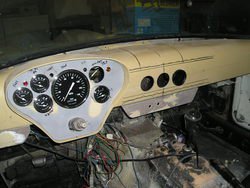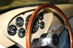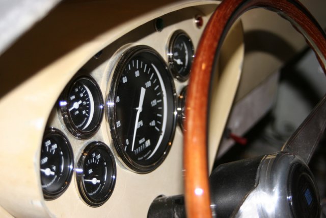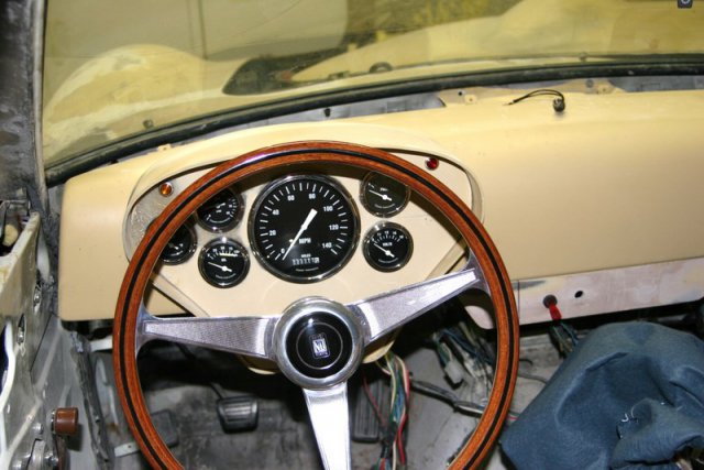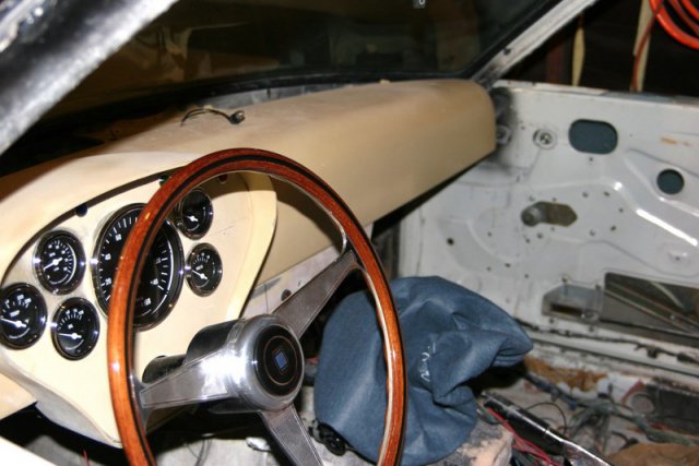 I have been looking around for the right gauges that have the vintage race feel as well as gauges that resemble the original six gauge layout - one large gauge in the center and five smaller gauges. I decided to go with a 5" speedo in the center as opposed to the tach and five 2.25" smaller gauges. I drilled the holes and mounted the gauges in the removable Nacelle. Its taken me a lot of time to finalize the dash and gauge setup but I am happy with the results. Here are some preliminary photos of the fiberglass dash, gauges and Nardi steering wheel. I will be painting the dash crinkle coat black. I will also have a switch panel as seen in the pics which hangs from the dash. This panel will have the key ignition and various toggle switches. The only column switch will be the turn signal. The next step is to finalize the heater/fresh air dash vents. I took the car for spin the other day. That LS1 really moves!