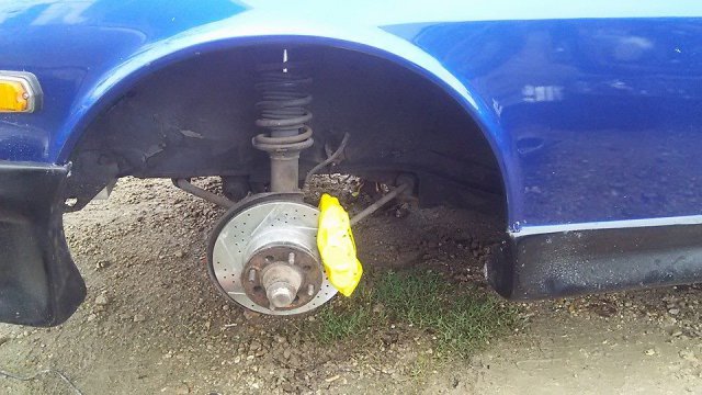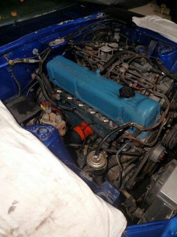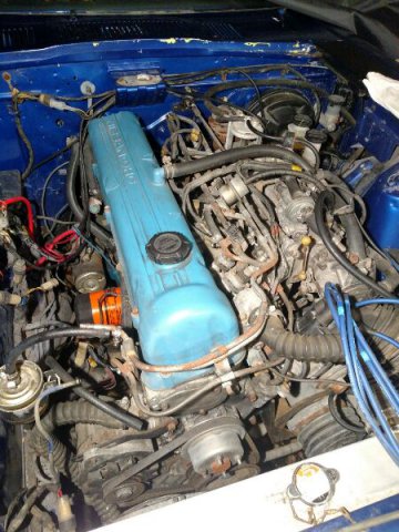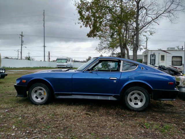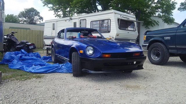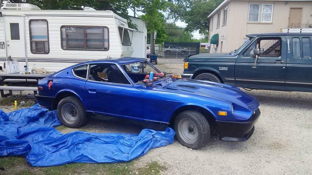 Hey all, new here, posted a few times and and decided it was time to start my own thread. I know a little, know I need to learn a lot and am open to suggestions and input and am sure I'm going to have questions along the way. The story on the blue dog is that she was acquired in trade for a cpl weeks of nights and weekends working on one of the po's other cars. She was a far from finished project that had been sitting for 4 years. She came with a lot of uninstalled parts including the aero body kit, new in box which was fortunate because I had to put the bumpers from blue dog on the other 280z I was working on in trade. I temp painted and installed the body kit, rear hatch glass, head lights door handles blinkers tail lights, seats and all the other bits and pieces remove for paint. Installed the bigger master cylinder, drilled slotted rotors and Toyota 4x4 calipers up front and 240sx w drilled rotors in back, still need e brake cable. I bought a windshield but an overzealous neighbor who was helping managed to break it. I have since found another one for 20$.