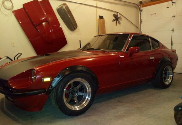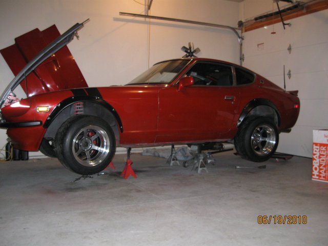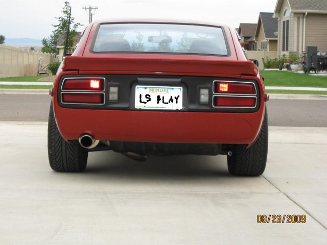 1. This is a 1975 280z with an LS1 and T56. 2. I used Johns car kit for motor/tranny mounts and driveshaft. 3. I used a camero ls plastic tank and pump. The motor has Patriot 205 heads, comp cams 11-424 cam (558 lift), 85 mm throttle body on a Professional Products manifold. 30lb injectors with 75lbs of pressure. MSD Blaster coils. Sanderson headers 2.5 inch into a single 3 inch. 4. I started on January1st 2009 and just finished in August 2009 5. Other mods include tokico adjustable shocks and springs. Toyota 4x4 front calipers and maxima rear disc brake setup. 2+2 brake booster. polyurethan bushings. Quaife rearend and Wolf Racing cv halfshafts. also bigger swaybars.