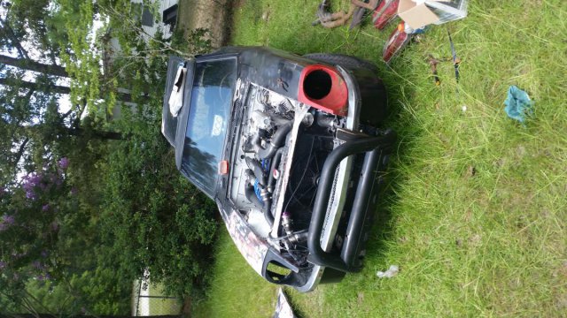 Just a quick update. I went to the scrapyard and picked up an intercooler off of a saab 93 that fits very well into the Z. So now that is mounted and ready to go. For the alternator, i am going to use my 280zxt alternator. To make that work, i had to shave 1/4" off of the 1G alternator bracket. I havent finished mounting it yet, but i need to make the "slider" so i can adjust the belt tension. I was hoping the 1G one would work, but it doesnt. It is no biggie. I am currently in the process of making my scoop, I am on my 2nd layer of fiberglass. It is shaped with the hood and isnt raised up too much, and the breathing hole is facing the windshield so it can let some heat escape from the bay. I would post pics, but i still dont know how to upload them so they arent flipped.. annnnnd, i may or may not be putting a bullbar on my Z aswell...More than likely I will, just because it is "different" and it honestly looks pretty badass mocked up. Then again, everything about this build is pretty different so it isnt much of a surprise. Oh, i also managed to smash my headlight bucket pulling the Z from my back yard to my front.. My lifeless Z rearended my tC. Idgaf about the tC, im more upset about the cost of a new headlight bucket.