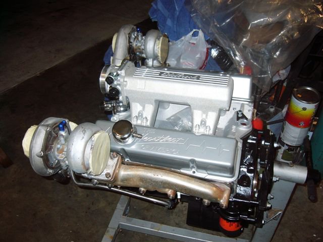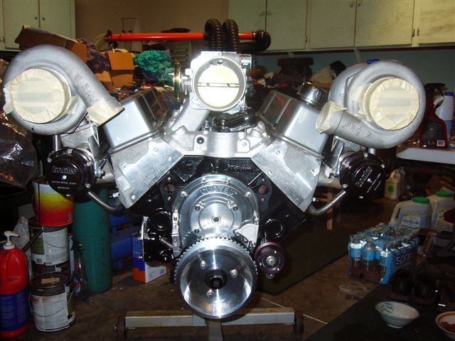 Dale..as long as we're dreaming, might as well dream big, eh? Chevydoc...yes Doc, Specs to follow: Engine: 415 SBC 3.875 stroke/4.125 Bore, 8.6:1 compression ratio World Products Motown Block 4 bolt mains, O-ringed, splayed billet main caps, priority main oiling Scat forged crank and H-beam 6" rods JE custom turbo pistons, hellfire rings AFR Eliminator Competition aluminum heads 227 cc, completely CNC machined 2.08/1.65 intake and exhaust valves Jesel aluminum shaft rockers @ 1.65:1 rocker ratio Manton custom length pushrods 3/8" diameter, .120 wall thickness Melling high pressure oil pump Milodon stroker oil pan Cloyes timing set and cover Comp Cams special solid roller camshaft: Grind CS 4872S/4872S SR 113 230/230 degrees duration @ .050 lobe lift .369/.369 " Lobe separation 113 degrees Comp Cams 954-16 valve springs Comp Cams solid roller lifters Milodon Copper head gaskets (.050)/o-ringed block Edelbrock Pro XT intake manifold 90mm throttle body F.A.S.T. 96 lb/hr low impedance injectors running at 52 psi Electromotive ECM and distributorless ignition High volume mechanical water pump(would run electric but too much EMI) 7" crank pulley/5" water pump pulley 200 amp alternator Banks twin 76mm turbochargers twin 44mm wastegates Banks cast iron turbo exhaust manifolds dual 2.5" inlet, single 3" inch outlet intercooler The rest of the car: aluminum dual-pass radiator with dual 13" fans Godley TH 400 transmission and driveshaft 8" 3500 stall converter 4 link/coilover suspension Full frame and cage 9" Ford rear with 3.50 gears/spool 13X15X32" Mickey Thompson ET Streets Aeromotive Eliminator electric fuel pump Aeromotive electronic fuel pump controller Aeromotive boost-referenced fuel pressure regulator -12AN from tank through 100 micron filter to fuel pump -10AN from pump to fuel rails -8AN return line E-Boost2 electronic boost controller Cooling Mist Varicool alcohol injection system 3" downpipes into 3" dynomax straight-throughs And that is about all I can remember...) Wayne -