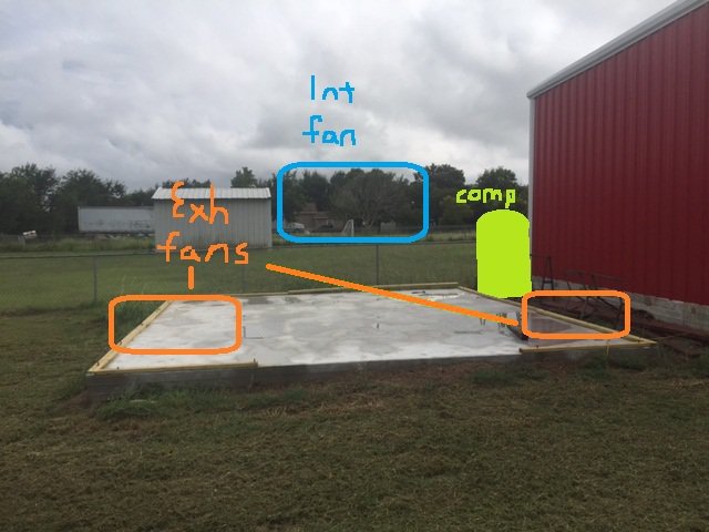 I have a 20 x 21 concrete slab that I'm working on turning into a paint booth. I've done a ton of reading on the subject over the last couple of weeks, mostly trying to find the best intake / exhaust type setup to use, but information seems to get pretty conflicting after a while. Some say to use pusher fans with a filtered vent, or puller fans with a filtered vent, many setups use both pullers and pushers for intake and exhaust. I'm not sure what all factors come into place when trying to properly design a spray booth (what type of fans to use, should one be high and the other low, are there special outlets that need to be used to reduce chances of explosion). End game is to have a properly functioning spray booth without using plastic walls, that I don't have to worry about going up in flames. I'm known to overthink things and have seen some pretty good paint jobs just by spraying a car outside in the elements, but since I'm building this from scratch I want to make sure it is done properly. - Should I use double plywood doors that swing open on hinges, and can latch closed to weatherstripping to make sure it's sealed? Or should I install a rollup door so it can open a couple of feet and set it on top of box fans for when I spray? - Wind where I'm at is typically 10-15 mph on average from the southwest, should I setup the vents and fans on the north / south sides of the shop to have the wind aid in air flow or set it up from east / west to minimize it? - I did have some pretty large fluorescent shop lights already set aside from the booth, but that was before I found out about needing explosion proof lighting. So I'm between boxing the lights in I have inside a cabinet with plexiglass, or springing for the explosion proof stuff. - What is the ideal setup for intake / exhaust flow when setting up the fans? I've seen some pretty good setups with squirrel cage fans, but also equally good setups with box fans. I'm pretty sure neither or these are explosion proof fans though. - Are there any special power outlets to be wired in to minimize the risk of fires? - Any other tips will be greatly appreciated, I'll be sure to post progress pictures as well.
