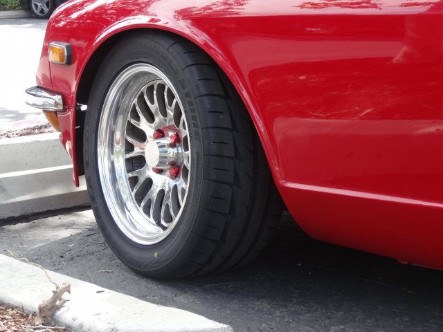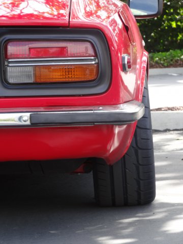 I have two (2) 240z's, one with 16 x 8" with a +13, 5" backspace on all four corners running 245 40's. The other is about the same setup also running 245's on all four corners. The fenders are rolled on both. The orange is not as low but the red one is about 4.5" off the ground. Both cars have no rubbing issues. Both cars have coil overs. Running 245's really enable the car to stick to the pavement incredibly. Rather than going with anyone's specific off-set, I would recommend that you buy that tool to measure the maximum tire/wheel your car can fit or go to a good tire shop and have them measure it. The reason to me is that everyone is likely to run different brand suspensions, etc. I think my Red Z if a slightly different off-set but I cannot remember what it is but I do believe it is 5" backspace, it is closer to a zero offset?. Thus if you measure it you can fit the max for your car. I know on my Red car that I think I could actually fit a 255 if I push it but doubt that would clear in the front so I opted to go front/back with 245's so I can rotate them. I am running about a -1" camber and get pretty good life of the tire (inside 1-2" might be worn down to no tread and the other end is usually at or more than the wear level so with rotating them I get decent life). Both Z's are running Arizona Z car front 12.5" vented 4 piston Wilwood brake setup. The Orange Z is running BC Racing coilovers and the Red Z is running ground control coilovers. Lastly both cars have no issues with turning the wheels to full lock, etc. no rubbing, etc. And yes both cars are running with no spacers....