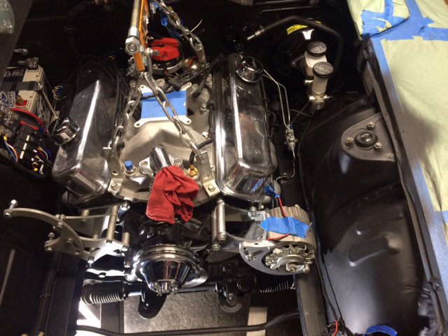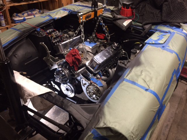 1. Grog and Twisted46, The alternator is 65 amps and I won't be running a huge stereo amp, so I believe 8 gauge will be okay. It think total it will be about a five-foot run. At the most, six. And I have been using the JTR book, but because this car had been hacked--not just wiriing, but on many other levels, the book is for me just a starting point. I think I have the correct wires for the HEI. At least I hope so. In a separate post today, I show some photos of us stuffing the engine onto its mounts. Feels good to have most of the wiring behind me, and the engine now bolted to the front mounts. (The transmission right now sits on a box. Fitting the rear mount will be next.)