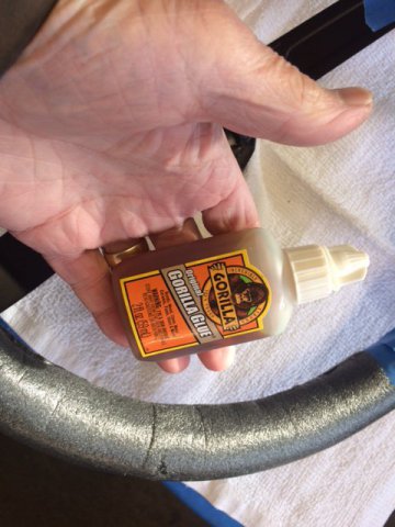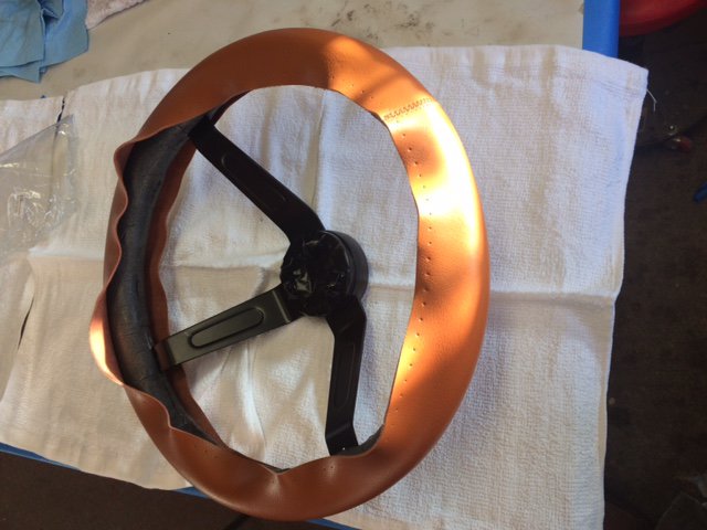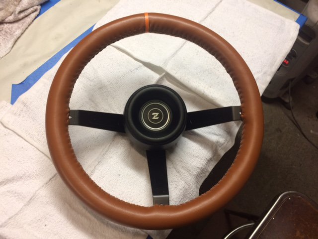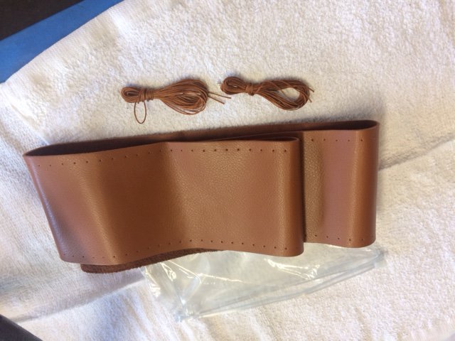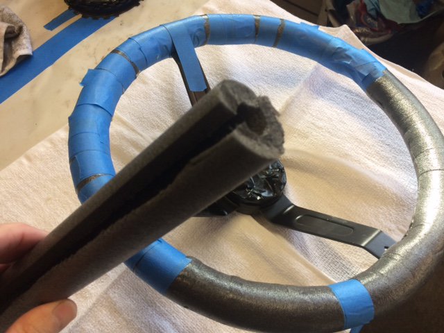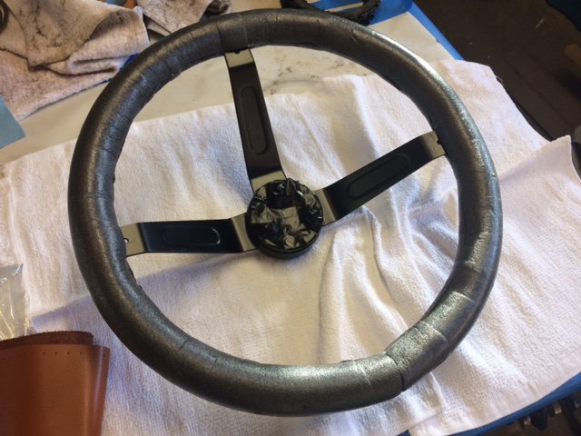 I'm waiting on a few transmission parts--so far I've spent over $500 on parts and rebuild kits. For that reason, I have looked for other projects to do in the warm part of my shop. The steering wheel was rancid. Dirty, of course, but also the rubber around it was rotted and detached from the medal frame inside it. At some point I'll buy a hub and a new wheel, but in the meantime I thought I'd try refurbishing it. I peeled off the rotted rubber, sanded the metal parts and shot it with Eastwood's satin black I had in the shop. Then I ordered--for less then $10 off eBay--a leather cover. At Home Depot I picked up some foam insulation for 1/2-inch pipe. It is spit and forms around the wheel nicely. But it was too bulky, so I cut away about 3/8-inch from one side. I cemented it on it two stages with Gorilla Glue, after first wetting the foam (that stuff reacts with water to foam up and then harden). I used masking tape to keep it in place while the glue set up. I did one half the wheel one day and the remainder the next. Then I stretched the leather cover over it and began stitching. There are a few videos on the net showing this process. Not hard, but it does take time and some concentration (I caught myself incorrectly stitching a couple times and had to pull stitches to make it right). Makes an okay wheel--not fantastic, but okay. It is a tad soft and squishy. But it does look far better than what was in place. And for less than $15 total cost, I'm pleased. If I were doing it again, I'd put the seam at the bottom of the wheel, not the top. I covered the seam with some painter's fine-line tape, creating a contrasting stripe like some racing wheels use. I'll probably pull it off. -