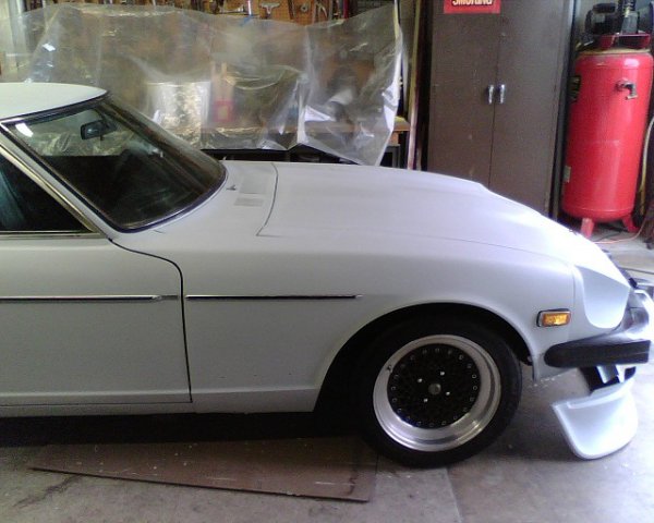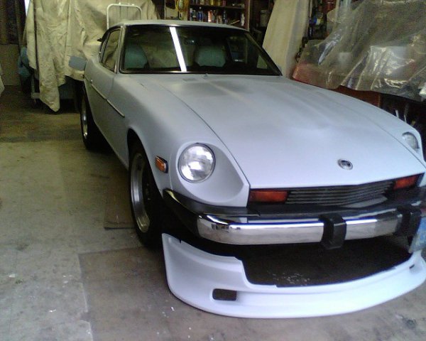 After trying to recover from the Mr2 and the l28et swap ,the mechanic from hell, and the supra. I decided I wanted to make my z all one color so Me , My friend Matt, And his dad went to town on making it happen. We used his dads little shop , bought a Harbor Freight Sprayer , Some good auto primer from a auto paint shop and got the other supply's. We spent a good 4 or 5 days on it came out pretty good for my 1st time painting a car . I got an air dam and painted it but never installed it cause I really wanted a 240z style air dam and turn lights. I removed the rear bumper cause it is very heavy and unattractive. Well here she is after the primer job I love the way the wheels made my car look but hated how they rubbed so much over every single bump