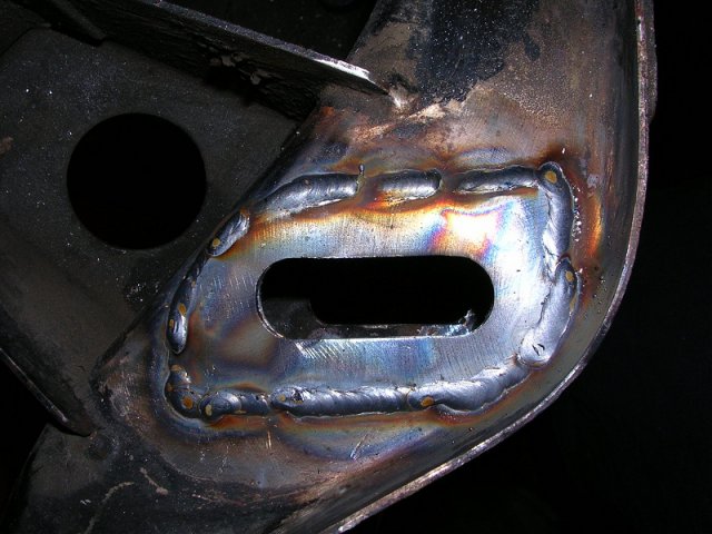 Here you go. Nothing fancy, just a plate welded on each side of the crossmember. I drilled a hole at the two ends, and then used a cutoff wheel to connect them. In retrospect, 5/8" is way overkill for the bolt size. I would probably run a 1/2" bolt and sleeve on the 5/8" rod end if I were to do it again. I guess I won't have to worry about strength this way. -