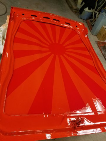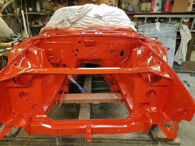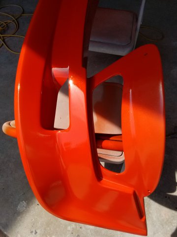 The wife is making all the decisions on body and paint for this car. She wanted orange base with micro fine metal flake .004 in the base not the clear. When the clear is applied the base has just flashed and the flake comes through in various amounts so some looks like orange and some metal. Then the car was set in the sun foe a few weeks. Brought back in the shop went over with 600 grit wet then re cleared with mandarin candy. I have not been able to capture the effects at all with a camera yet. So here are a few pics that show a little.