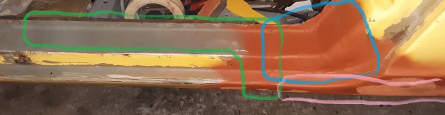 Thanks for the interest, Jughead. This is where I am now. I cut out the green-outlined section from the Tabco rocker and welded in. I fabricated the blue-outlined 'armpit' section and welded in. Then I covered the rear, pink-outlined, section with the lower part of a Tabco patch panel. I've spent the last few weeks on another car, but will come back to this after I get another bottle of shielding gas. I've still got the door bottoms and tailgate bottom to do, plus join up the floor bottom frame rails to the remaining front frame rails. -