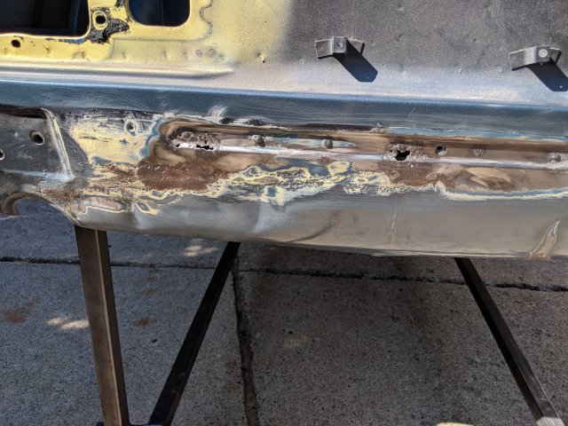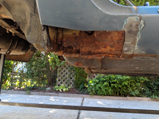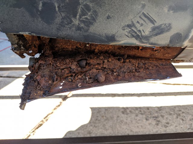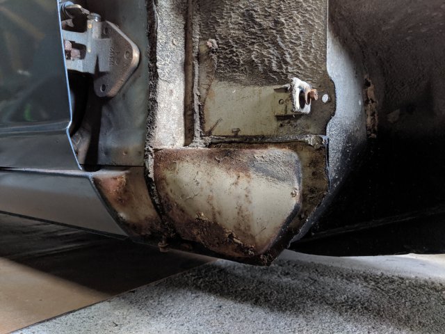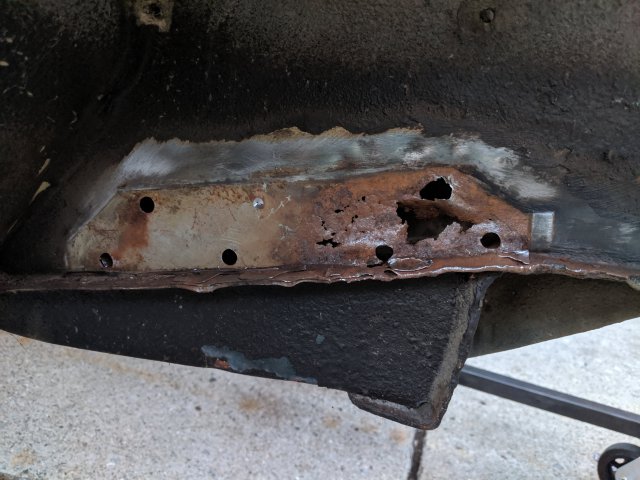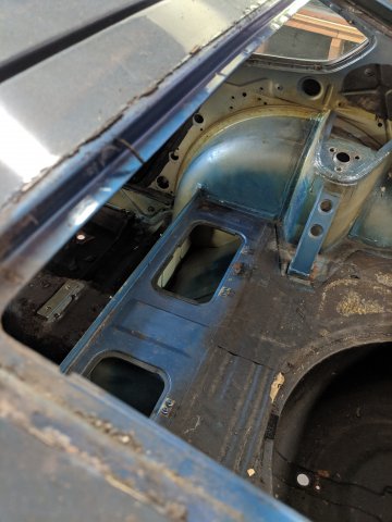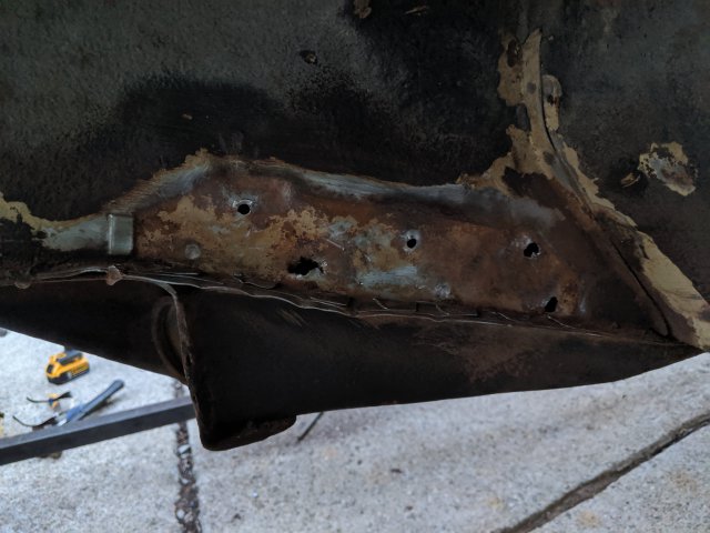BMW S54 into S30 Chassis - Build Threadcarbuilder723 replied to carbuilder723's topic in Other Engines So this last week was about getting the shell up onto a frame so that I could roll it around the garage and driveway. Also, a friend and I went to town on removing all of the sound deadening from the floor pans. Dry ice was our friend here, but even the trans tunnel material was still a total pain. Then I started to cut into the some of the areas where I was suspicious about with respect to rust... let's just say, I was right to be suspicious. Looking up into the dog leg cavities, the metal looks in really good shape, but the bottom skin and secondary layer will definitely need some pieces replaced. The rear valence (as suspected) was also full of bondo so I'm likely going to try to just replace this entire panel.