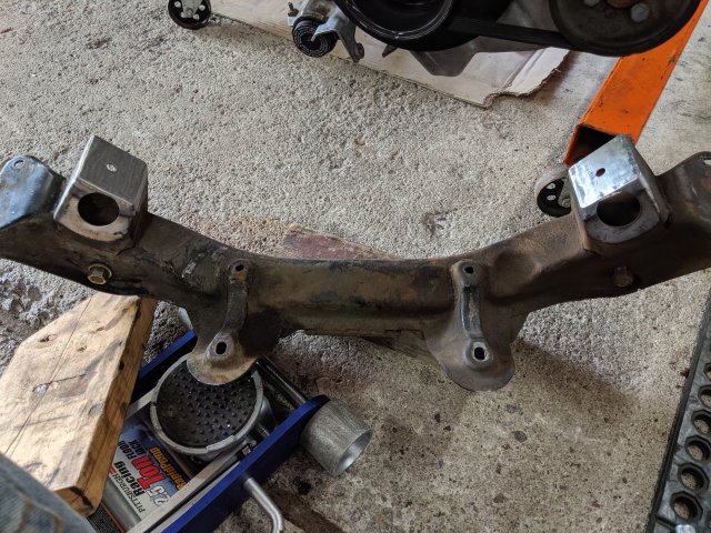 BMW S54 into S30 Chassis - Build Threadcarbuilder723 replied to carbuilder723's topic in Other Engines Progress is being made, although a bit slow. Big news though... I test fit the engine for the first time and, surprisingly it fit (sort of).The first test fit was with the front sub-frame completely unmodified. Just the engine adapters sitting on the BMW isolators sitting on the Datsun sub-frame. In this configuration, there was an interference at the back of the engine with the hood latch bracket, and with the exhaust at the right hand frame rail. Surprisingly though, the oil pan to Left side TC rod mount seemed to be reasonable enough with out any modification. The previous swaps I've seen with this engine had required the oil pan to be trimmed in this area, but (for the moment) it looks like I won't need to do that. Also in this configuration, the front of the engine sits very high... high enough that I think it would be a problem with the hood fitting. So... the next thought was to take the front of the engine down a bit, so I cut about 1.5 inch off of each standoff on the front sub-frame. I haven't test fit this in the car yet, but it put the front of the oil pan approx 2 inches closer to the cross member in the front. I figure this has a few benefits including lowering the CoG, clearing the hood and possibly solving the interference at the hood latch. We'll have to see once I refit the engine with the modified sub-frame in the car.