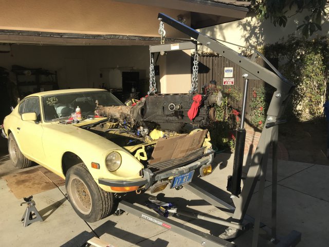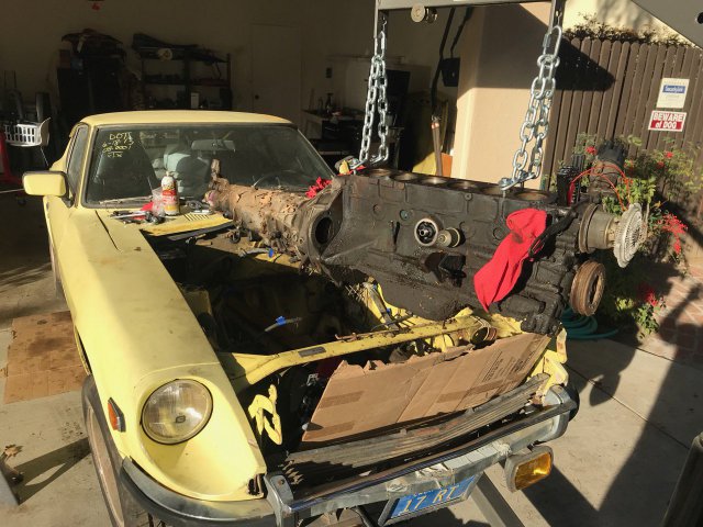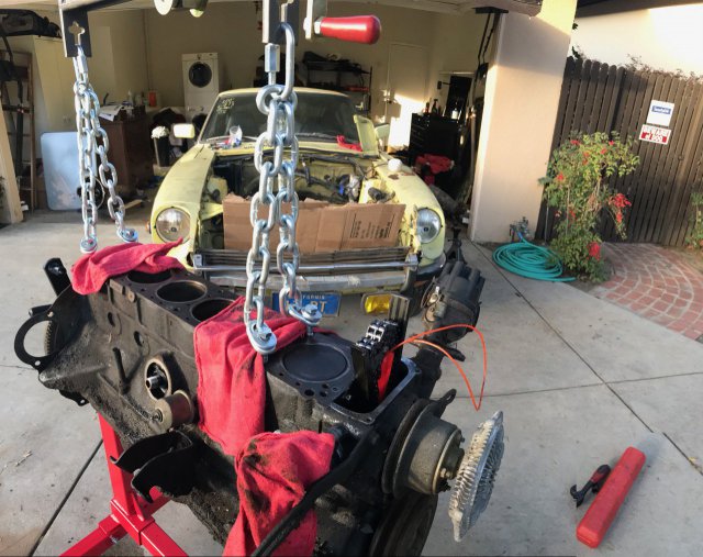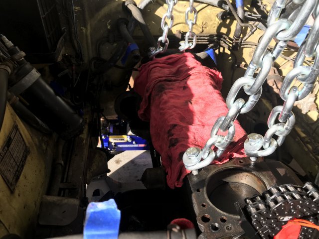 Just wanted to follow up on my results on pulling the engine with the head off. I ended screwing some bolts in into the head-bolt holes with some chain and washers on them. It worked great and was pretty easy to do. Pictures attached.