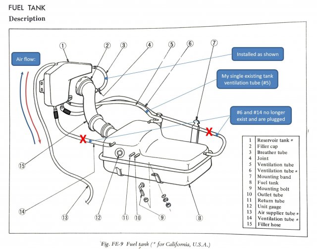 4. Hi All, I'm trying to retain my factory fuel "reservoir tank" (the small metal tank behind the passenger-side rear wheel arch) despite some fairly drastic mods. In reference to the attached image: - I've retained one large ventilation tube (#5) and it's connected to the factory location on the reservoir tank. - I've eliminated two of the fuel tank ventilation tubes (#6 and #14) due to main fuel tank geometry. - I've plugged the corresponding inlets on the reservoir tank (for #6 and #14). - The reservoir tank is connected to the fuel filler hose as shown (and as designed by the factory). I would like to use hose #13 ("Air supplier tube") as my only fuel tank vent/breather and run it outside the car, well-grommeted through the factory hole just behind the rear wheel arch. - Is this an acceptable method of venting my tank? - Is the fuel tank ever supposed to hold positive pressure? If so, this would make my solution incorrect... - Should a fuel tank setup ever allow a vacuum to be drawn due to fuel consumption? If not, my solution solves... - Is it correct to assume that since #13 is called an "air supplier tube" air must be able to flow: ----> in the blue direction to counter vacuum due to fuel consumption ----> in the red direction to prevent pressurization due to vapor expansion - Is there a need for a check valve of any kind? I did attempt to search the forum before posting but failed to find specifics to my questions above. Thx, njm