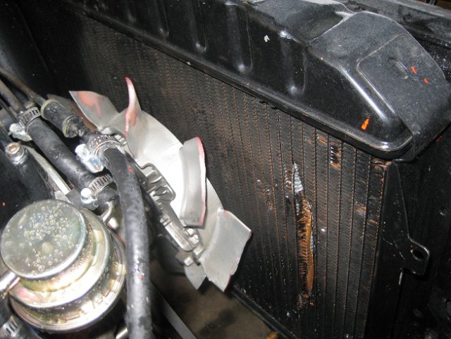 The radiator is not that old, and is mounted very firmly using the 4 stock mounting bolts. The core support is solid as is the radiator core and surround. There is one major wound to the radiator I think the other cuts are from the fan blades breaking and flying off. Do you know how much clearance theres supposed to be between the fan blades and radiator stock ? I dont know if my clutch fan is original, I think they started using plastic fans in late 71 or 72. Earlier were metal. -