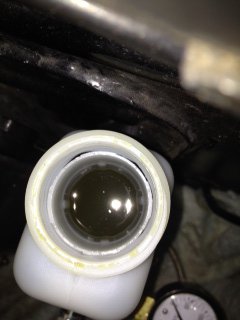 Posting a few pictures that may help diagnose/fix the problem. Brake fluid was about 2 weeks old. One photo shows how it looked in the master cyl. Then I bled some off into a tuperware. Paper toweled out the reservoir and the dark gray residue had a fine metal flake appearance. Final photo shows the color and clarity of new Motul high-temp brake fluid. There appears to be NO fluid leaking anywhere.. Level is staying constant and no drips from bell housing. Search of internet suggest that the fluid shooting up in the reservoir is sign of a bad seal somewhere inside the master. Gonna order a new master cylinder, and while waiting for it, gonna get a brace made to stop the firewall from flexing. Will change the master and bleed everything again. If that doesn't fix it, then I guess the tranny comes out..... After flushing the system last night, drove car 4 hours today on roadtrip. Fluid is dark again. -