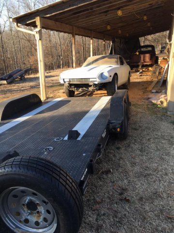 After 2 years of begging, I finally got a widow in my town to sell me her husband's project '75 280z. I found this car thru the widow's mother-in-law who commented on a picture in my exam room showing my daughter (Rebekah) standing next to my 240z at the drag strip way back when we did the science project that started me on the hybridZ bandwagon. I went and looked at the car, which had been in dry storage since 1989 and found the best set of fenders, floors, and rockers that I have EVER seen. The diff isn't even dirty! Some of the original paint had been sanded off on the top side of the car and left raw, so it had a little surface rust on those panels, but it was otherwise in original paint. The fuel injection system was half disassembled and the radiator was leaking. I offered her $300. She let me walk. I kept going by dropping notes in the mailbox to let her know I still was interested. Last month, mother-in-law has a second surgery with me (the other eye), and says: "You really should buy my daughters car from her." So I call her up. The car had been moved to a barn at her brother's house (the same brother who told her the car was worth $5,000 back when I offered her the $300). He had sprayed it with primer (no prep/no masking) to "protect it." It's when people lose interest in these rust magnets and put them someplace damp that we lose them, after they've had crap stacked all over them and gotten lots of trailer loading rash. I started to panic and offered her $1,500. She accepted. I took a day off and went out with the trailer. Way down in an Alabama holler in a lean-to with a dirt floor sat the Z laying on its belly with 4 flat tires. But it had only been out there for a season. So I put some of my tires on it, cut one brake drum off and loaded it up. Now it is in my garage getting cleaned out and lightened up to go into dry storage until I break 200mph in the blue 240z (my goal is do do that by 2020). I did a lot of cleaning out crap yesterday and hope to pull the motor/tranny today. I put new valve stems and 4 used tires on it and finished disassembling the brakes (which were largely seized by pad/shoe rust making it really hard to push around). Hopefully the diff will come out next week (you just can't get enough R200s) as well as any cloth or carpet in the car. I don't want to find a bunch of rats and rust in this thing when I get back to it. Then it is off to storage till I'm ready for it. The title states the plan for an 1/8-mile, 1/4-mile, 1-mile racer. BTW-the guys in the picture are all my local Z buddies; I'm on the other side of the camera, grinning from ear to ear!