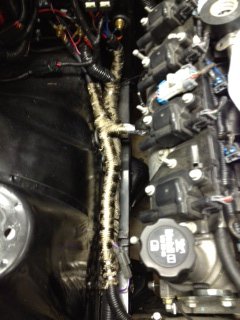 This weekends progress. Put engine in for final time (I think). I swear I installed and pulled that motor 10 times trying to get everything right. As everybody warned me, poly motor mounts were a PITA. I pray I dont have to pull the motor, or even lift it, to install the longtube headers. If I have to, I may just sell my longtubes off. They are at the ceramic coating place right now (or on the way). Don't know how long it will take to get them back, so I'm toying with installing the JTR headers that I have, just so I can get car running and start finding leaks, etc. Spent most of weekend finalizing passenger side wiring harness for the engine. This is the harness that includes the hot wire to the alternator and starter, and also includes the primary ground wire for the battery-engine and battery-chassis. I used the GTO cables and cut them down a little, re-routed wires for maximum exhaust clearance and to avoid the tight spot between the lower steering u-joint and the alternator. Soldered new lugs on the cut cables. After cables were all sized and trial fit, I wrapped them in split loom, then wrapped the areas close to the exhaust in header wrap and secured it with metal ties. When i can drive car over to buddy with a sheetmetal brake, i will make a heat shield between header and wiring. Wrapped starter in a heat-reflective blanket. Tomorrow, I plan to finish fuel pump wiring (I can't seem to get under car for this while sun is still shining! Then, I think the only wiring I will have left is to hook up speedometer and tach. Then, when I have time, I'll start making wiring harnesses for racing aids like 2-step and line lock. Then heater, wipers and radio, R200 LSD conversion with CV axles, shortened rear LCAs (when will this end!!!!). Clutch line is installed and tightened, motor is totally in with torqued bolts and a fully installed driveshaft. Tires are off for brake bleeding, then I'll bleed clutch line. Hope to buy fluids on Thursday and start filling on Friday. The coming weekend should be noisy-will post video if I can figure out how. -