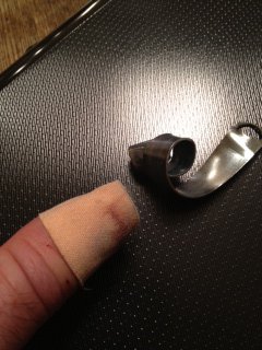 I always see threads started asking how much it costs to do an engine swap into a z-car. I'd like to post the question another way: How much of YOURSELF have you donated to your z-car? I've seen lots of threads showing mechanical carnage, but none showing physical carnage. For example, I offer my latest car-work related injury. See pic. I was trying to increase the mounting hole size in a strap hanger in order to support my LS2 wiring harness at the back of the intake manifold by re-drilling the bolt hole with my drill press. Drill bit found a bur in the sheet metal, yanked stainless steel strap from my grasp and wound around the drill bit, pinching the pee out of my thumb. My thumb actually fit inside that wound up metal strap! Luckily the strap tore off the drill bit with my finger wrapped up in the sheetmetal rather than continuing to rotate on the bit, or it might have been more ugly. No cuts, just major crush injury. May take another photo later without bandaid, but right now if I remove bandaid it just starts bleeding everywhere. So much for getting car running by Sunday! Maybe next weekend. I tried to just wrap it up in masking tape and soldier on, but I can't seem to do anything without a left thumb. Finally went to my office and gave myself a nerve block, so it is tolerable for the moment, but I may wake up screaming in the night when the block wears off. The up-side is that my wife has to unbutton my britches so I can pee. It hurts like hades. Post your best z-car work related injuries.