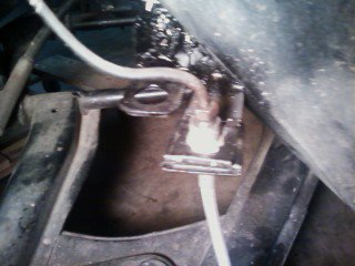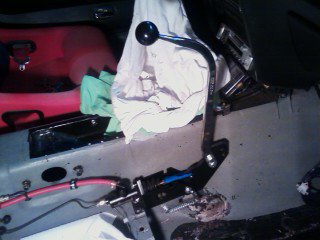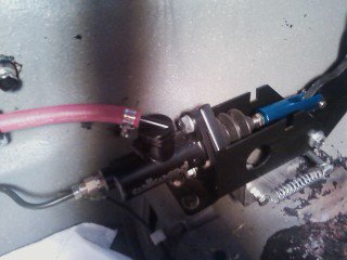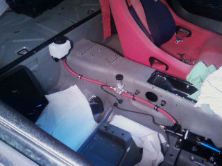 Here are some pictures of the hydraulic handbrake system I'm building. The red line connects a remote reservoir to the master cylinder. The proportion valve is not part of the hydraulic hand brake system, the red line just passes under it along its route. The proportion valve is for the standard foot brake system. The remote reservoir is needed for seat clearance. Someday I will find a straight handle instead of the curved one.