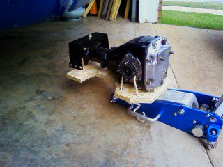 I dropped my R180 onto my head one too many times this weekend and came up with an idea of how to make diff install much easier. I'm putting in an LS2, but I'm going to break my WRx diff before getting anything stronger, then i have access to lots of worn-out R200s that I will try to have welded and then break a few of them before paying thru the nose for a CLSD R200 or even yet a R230 install. Anyway, start with a $59 Harbor Freight lightweigh aluminum jack. Drill two holes in the lifting pad. Cut out a sillouette of the diff from 3/4" plywood and drill some holes in it and bolt it to the jack. Put two ropes thru it to tie around the output flanges so the diff doesn't fall off and break off a half-shaft bolt, and there you have it-a homebuilt diff jack. Makes install a dream!