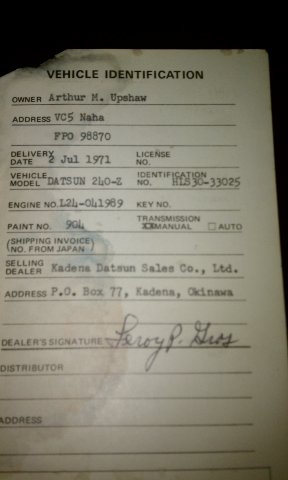 now i do have what i believe to be the original owners manual and on the inside cover the information reads that the car was purchased in Kadena Okinawa Japan. i dont remember the address off hand. the VIN# does match the book.(all typed in English) i do have a few of the 2nd owners registration papers and the car does have stickers for an AF Base in Maine and San Diego. it also has a sticker for the Dept. of Defense.( i dont know if any of that helps but you never know.)