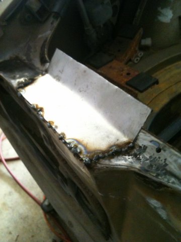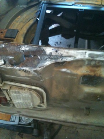 13. I finally got tired of putting off the rust repair on the rear hatch deck lid area. I had planned on buying the repair panel from the Z store, but wanted to see exactly what the damage was first. Thought this might help those on this site with the limited metal working skills like myself. This is what I started with. I was able to cut the top piece off by drilling through the old spot welds. I found that most of the metal under the top piece was still pretty good. There were a few spots, mostly towards the corners, that really needed attention. So I gridded down until I saw clean metal all across the top and around the edges. Looking at what I had, I realized that even if I bought the repair panel, it would only replace the top. I had to do something about the underside. So I got to it. Here is how I repaired the left side that had rusted through. The rust went all the way from the outer edge to lip that the weather stripping attaches. I started by cutting out the bad metal and tried to keep the cuts in a straight line. Then I made a template out of cardboard and used it to cut the patch piece out of 22GA steal. I got a piece about 2'x2' from Lowes for around $20. Please excuse the welds, I had a hell of a time getting the weld hot enough to penetrate the new steal without burning a hole in the old sheet metal of the body. I welded from the outer edge up to the first bend. That would give me an anchor on either side to bend the first section. Then I took a scrap piece of 1" square stock that I used for my fuel cell cage. I cut it down the same width as the top of the patch panel to give me something to bend the entire piece as straight as I could. Worked surprisingly well. I used two C-clamps to secure the square stock in place and to bend the steal. I did the same for the very top lip section. Welded up to the next bend and used the square stock in the same way. When I cut the patch panel I made it a bit longer than I needed so I would not come up short and would have something to grab and bend. It would have been a pain to try and bend a 1/4" lip. And here is what I was left with before trimming it up, welding the rest, and grinding it down. And now the finished product, sort of.