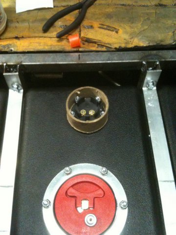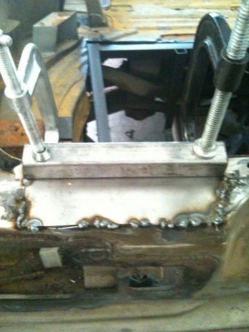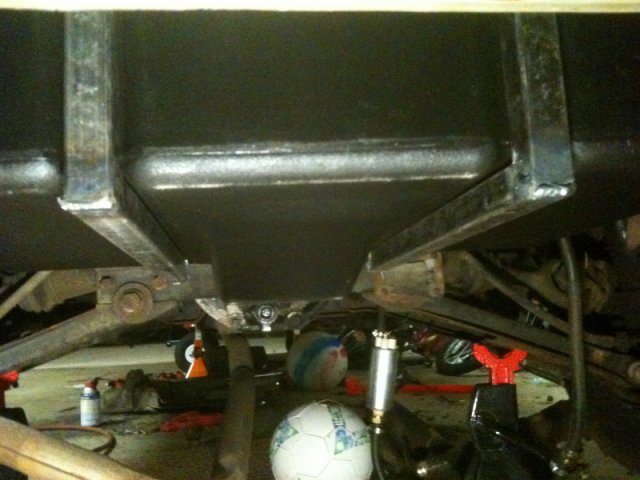10. Okay since my last post I got a few more things done. After talking to a guy that I am thinking about have do my floor pans, I changed the fuel cell setup a bit. He has professional race car building experience and is concerned that the aluminum straps I bent to hold the tank will crack under the stress. So to be on the safe side I took his advise, and made a cage out of 1" square stock. I did 45 deg cuts and welded them together, then welded it in the original square frame. I reused some of the aluminum to make the top straps. Ill be taking better pics soon after I take it all apart and paint it.