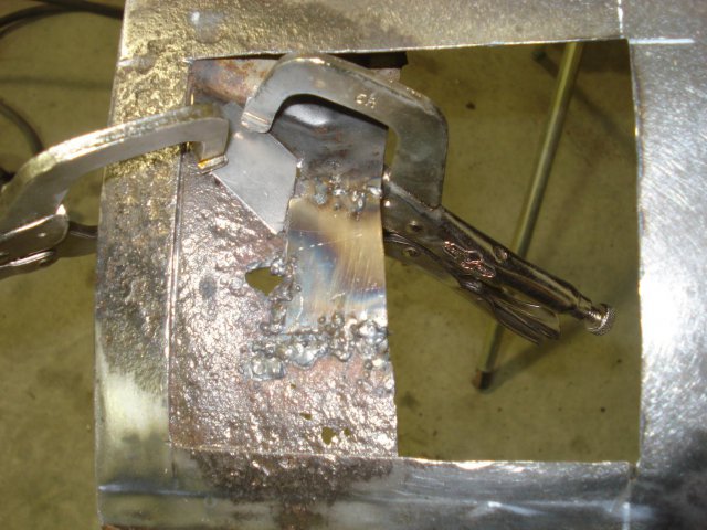 The hood turned out to be in real good shape. I found one crack near the left front edge, and 2 dents that had a fair amount of filler along the front edge. I used a stud welder I got at Harbor Freight to weld studs to the dents and pull them out. Not perfect, but each dent will now only require a skim coat of filler. I used the MIG to fix the crack. -