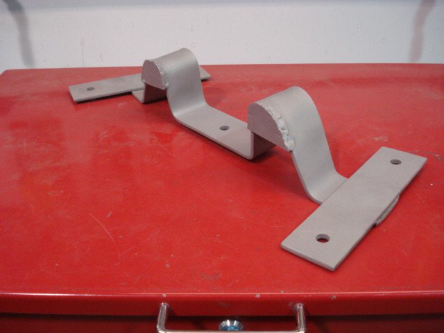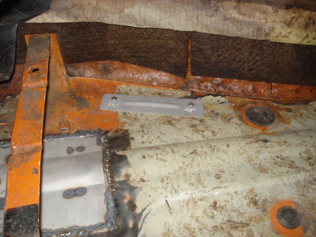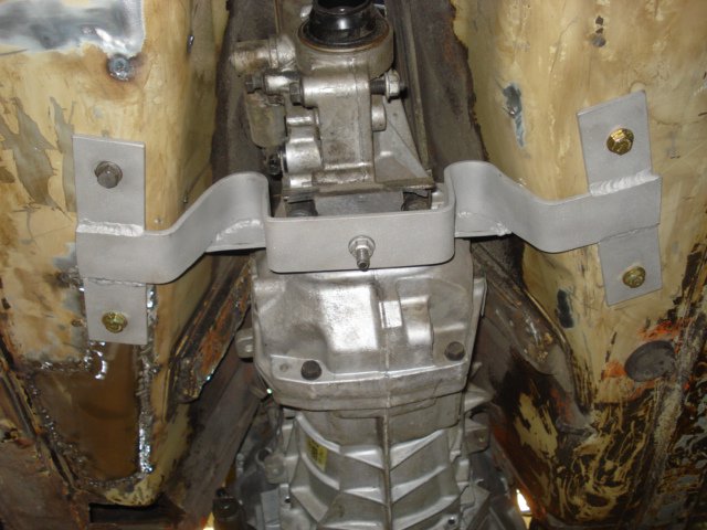 Here are a couple of shots of a T-56 cross member I made for my '73 240Z LT-1/T-56 swap. I used 2" X 1/4" bar stock. I heated the bar stock with an oxy-acetylene torch to make the bends. I welded a couple of nuts to some 18 guage metal and ran the mounting bolts up through the floor. These will ultimately be tack welded to the floor after I finish up patching the holes in the floor...