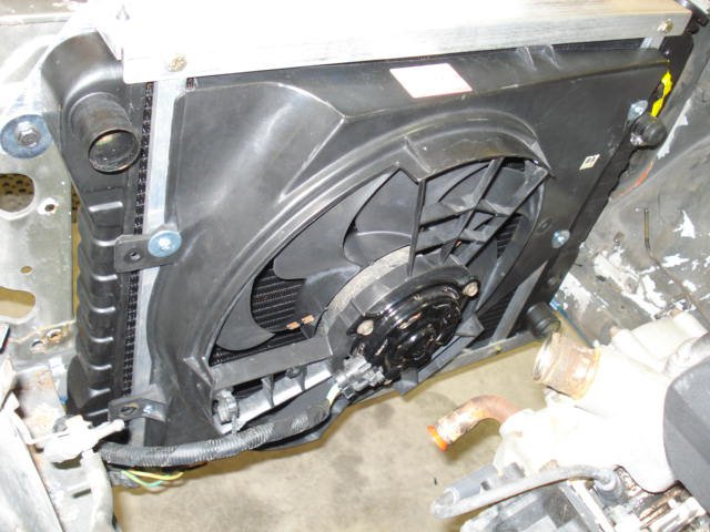 Ok, I have only been able to squeeze in an hour here and there, but I finally got the engine and transmission mounted in the car. The JTR mounts are in place for the engine and the tranny is currently held in place with a lug nut wrench (X shape) and a chain. I made a cardboard template for the tranny crossmember, similar to one I saw here on the site. We shall see if my welding skilz are up to the task of fabricating it, otherwise I'll take the template to a machine shop and have one made. I have a R/T diffy mount that is ready to go in once I remove the exhaust hanger bracket that is in the way. I don't have a drill that will fit into the tranny tunnel so I can't drill out the spot welds. Harbor Freight, here I come, I need a cheep right angle drill! Once I get the tranny crossmember installed I'll take the car to a drive line shop to have the drive shaft shortened and the drive line angles checked. The next stop will be a muffler shop to get the exhaust system built and installed. I've got a pair of the Sanderson "D" port headers from JTR that I still need to test fit. Based on the experience of others, these should do the trick. I picked up a Wilwood small clutch master cylinder from an outfit called Speedway Motors (http://www.speedwaymotors.com/Wilwood-Clutch-and-Small-Brake-Master-Cylinder,8567.html). I also picked up an adapter that will mount in the stock T56 slave cylinder and allow an AN3 fitting to be used. The clutch plumbing should be easy. I'll post pics after I get it plumbed. I bought a radiator locally that should be the same as the one offered by JTR. It fit perfectly in the JTR radiator mount. I haven't got the radiator hoses yet, although I've got a few ideas on how to cut & plumb them. I picked up a 2-speed electric fan at a salvage yard from a '90's Merc (can't recall the specific model). It fit perfectly in the JTR mount. I drilled & tapped 2 mounting holes on each side of the aluminum uprights to mount the fan. Here are a few shots of the recent progress. -