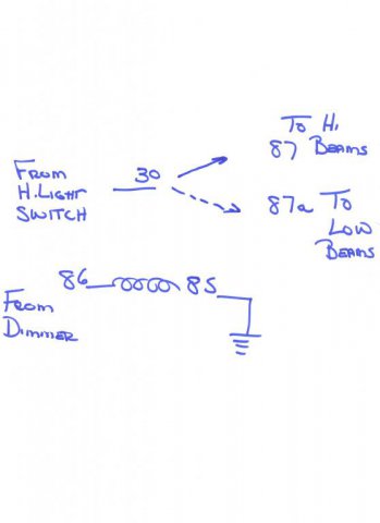 You need to power the headlight switch and the dimmer switch separately and you only need the common and one wire from the dimmer switch. It is not being used to switch from hi to lo beam it is being used to energize and de-energize the relay. Relay energized is hi beam and relay de-energized is lo beam. Headlight switch off is dark. If it not clear let me know -