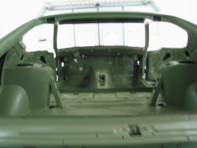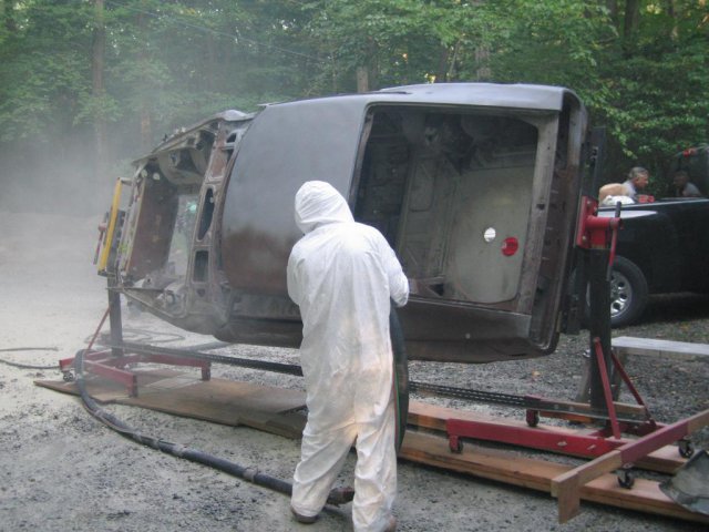 Today I had the guys from Mobile Blast Away over to blast the shell. They use a slurry of powdered glass and water that works incredibly well and will not distort even the thinnest metal. Then I loaded up the shell and took it to a friends body shop. Tomorrow I'll DA the shell and get some etch prime on it
