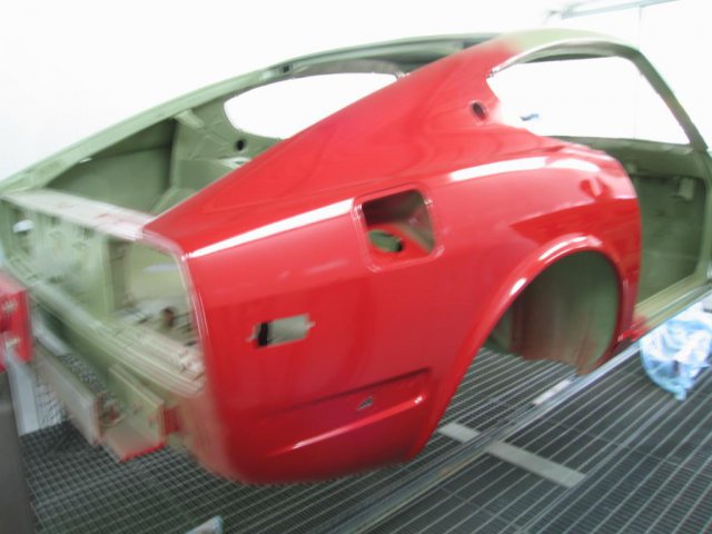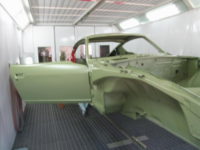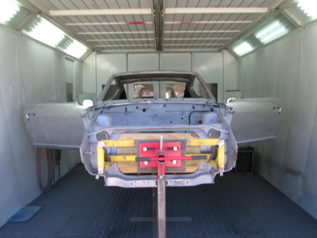 Never thought it would be so tough to get the shell clean of glass from the media blast. Spent two days blowing, vacuuming, rotating, sanding and wiping. Finally ready we rolled her into the booth and coated her with etch prime. While we were at it we quickie painted the right rear quarter, just enough so my wife can see the color. Now that rust is not an issue I'll start the bodywork