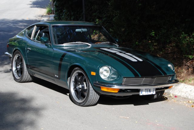 After only 7 years, the project is now on the road, sorting it out, have about 300 miles on it. Still working on a few things but its comfortable, reliable, sounds great at higher revs, gets lots of looks and with the torque i can turn a slow corner in 4th and accelerate in 4th hard without need for downshifting. Will probably be at Willow Springs in October for Cobra Club event to get some further testing done. Here's an overview with pictures of early fabrication, body and paint, final: body: stripped to bare metal, stock except for hood and deck emblems shaved, recessed side marker lights, 3 piece rear bumper converted to one piece. Brooklands green with black “Boss 302†style stripes under clear coat, V10 emblems, NO fender flares Structure: 10 point cage, steel box section beams front to back spliced through the floor pan, firewall moved back 4 inches, floor reshaped for trans clearance, fuel cell, battery relocated to rear, fuel and brake lines routed through passenger frame rail. Suspension: Arizona Z Car products front and rear, road racing struts / control arms, coil overs, adjustable shocks, 6 piston Wilwood front calipers, 4 piston rears, moustache bar, sway bars. 18x7 5Zigen front, 18x8 5Zigen rear wheels, 225x40-18 front, 275x35-18 Michelin Pilot Sport tires Drivetrain: Gen II Viper V10 crate motor (460 hp, 500 ft lbs torque), 6 speed Tremec T56 Viper trans, R200 differential, Quaife limited slip, Modern Motorsports half shafts with CV joints, oval exhaust (for ground clearance) by Doug Holmberg, balance tube, dual exhaust, Magnaflow mufflers, ceramic coated. Huge x Large alum radiator, oil cooler, hydraulic clutch Interior: BMW 3 series leather sport seats, dash modified for roll cage tube clearance and restored by Just Dashes, Autometer carbon fiber face gauges (speedo, tach, fuel, oil pressure, oil temp, volts, water temp), push to start ignition button, full stereo with subwoofer and iPod source, power door locks, Momo wood/leather steering wheel, Vintage Air A/C, heat, defrost, NOS 280Z.console Basic fabrication: Billet Works, Santa Clarita Body and Paint: McCluskey Ltd, Torrance