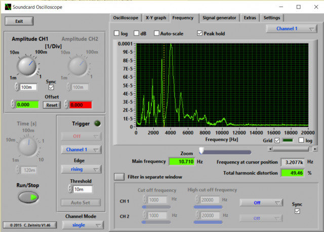 Actually, I tested mine today because I was curious and will probably head down this road in the future. Tested with a DIY soundcard Oscilloscope, hooked the two leads up and tapped the block with a hammer and this is what the response was. So then I hooked the leads up to a multimeter and tried tapping with a hammer to see the response. It wouldn't register at all, the signal is just too small. -