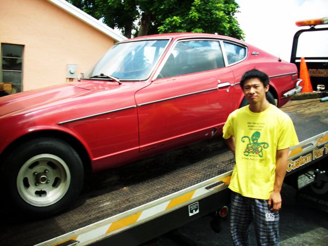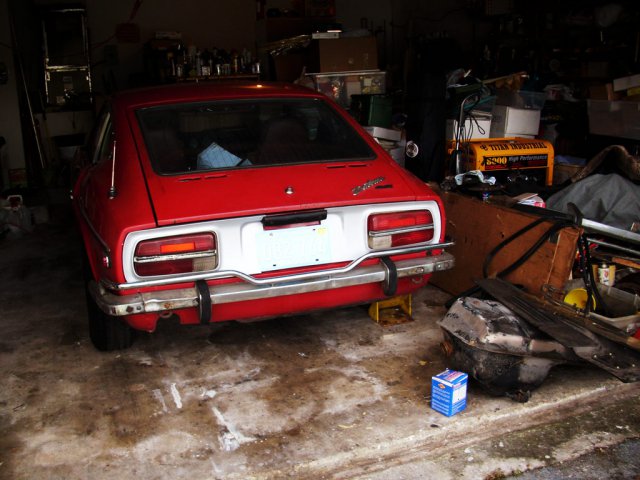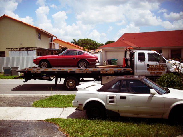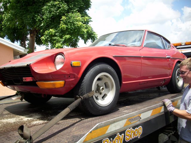 Well, seems like there's alot of new Z owners lately, maybe it has something to do with the crappy economy. I've always wanted one, and now seemed like a good time to buy. Anyway, after about a month and a half of searching and negotiating, I finally settled on this early 71 240z. It's got an L28 block with an early E88 head and SU carburetors. It's also got a decent sized speed hole under the driver's seat, that I'm gonna test my nonexistent welding skills on. Needs some fuel work to get running (starts fine on starter fluid) so hopefully within the next two weeks I'll have a running Z! And here's the pictures! 12pm today, delivery! Pwhew!