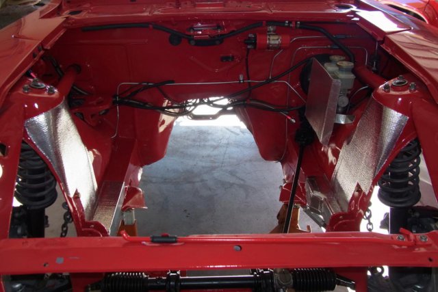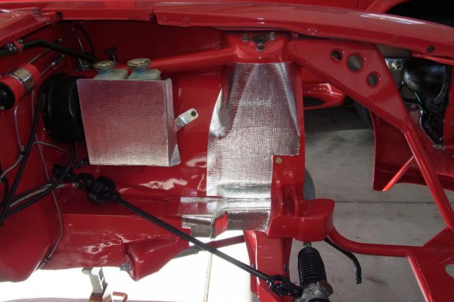 I have been working on rewiring the Z and preparing the engine compartment for engine installation. The first pic shows the Motorsports Auto type 3 air-dam with fog lights, which I wired to act as turn signals. The other pics show the Design Engineering Inc, #010399, heat screen with adhesive backing that can withstand 1200 F direct heat. The heat screen was applied to the areas where there was minimal header and down-pipe clearance. -