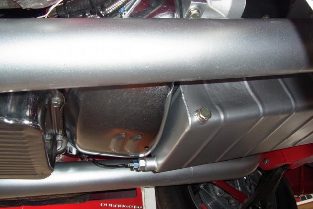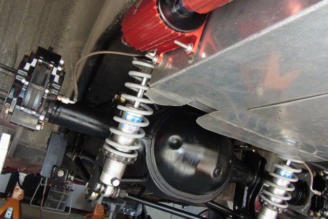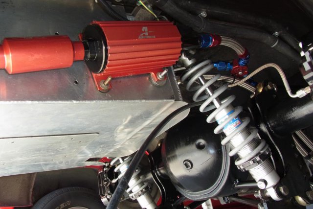 Two Aeromotive A 1000, #11101, fuel pumps have their AN-10 outlet fuel lines joined by a Y to a single AN-10 fuel line. This line connects to an Aeromotive A 2000, #13202, Bypass Fuel Pressure Regulator. An Aeromotive,#15107, One-Way AN-10 check valve prevents reverse fuel flow through the inactive fuel pump when only one pump is running for street driving. However, both pumps are activated during racing. Two Aeromotive, #12304, 100 Micron fuel filters are plumbed between the fuel cell and the pumps. The pics also show the Hal coilover shocks and 150 lbs. springs. The 9" Ford has been painted Rustoleum satin black with a brush. Brush streak marks add Character..... -