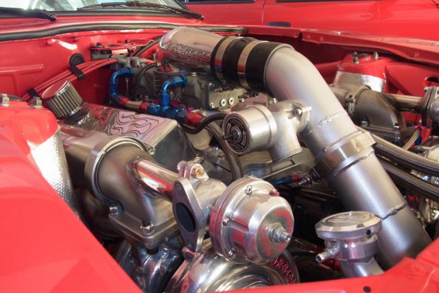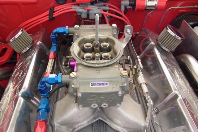 The carburetor is a Pro-Form 750 double pumper with Pro-Series, dual needle and seat, float bowls. CSU handled all the "blow through" modifications and installed Boost Referenced Power Valves in both metering blocks. The following MSD components provide ignition: Billet distributor, #85551, 6-BTM ignition box, #6462, and Blaster coil-2, #8203 The electric water pump is a Meziere, #WP 301 S, 55 gph unit and the one-wire alternator is rated at 140 amps. -