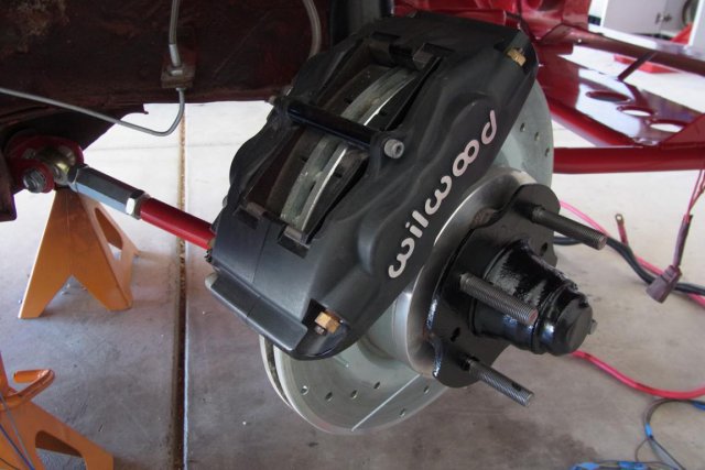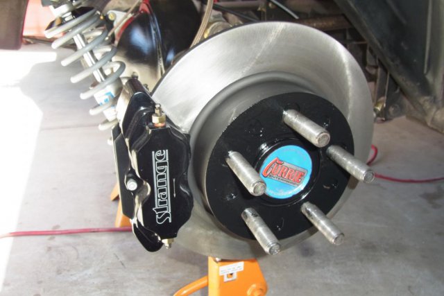 The Z is at home but needs everything to be re-assembled. Big 12" drilled and vented Wilwood 4-piston front brakes have been installed. It was a close fit but with custom off-set spacers the 15" Weld Drag-Light wheels fit. The pic also shows the Techno-Toy-Tuning Tension Control Rod. This rod is much stronger than the stock Datsun unit and eases caster adjustment. The 9" Ford differential received 11 1/4" Strange 4-piston disc brakes. The 9" is a Currie "Plus" unit with 31 spline axles and 5/8" wheel studs. The gears are 3.50's with a Strange spool.