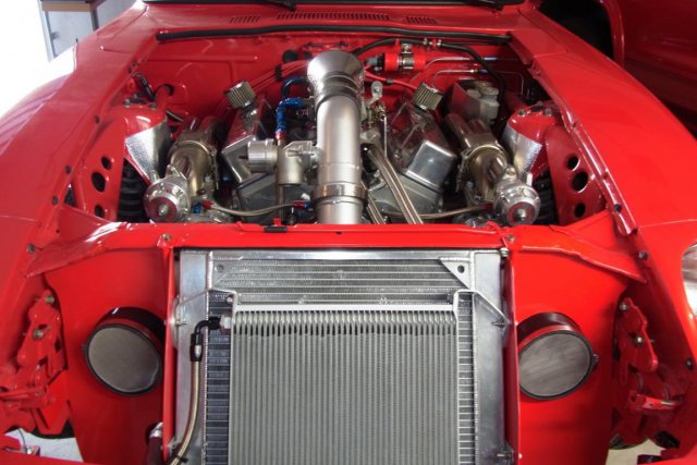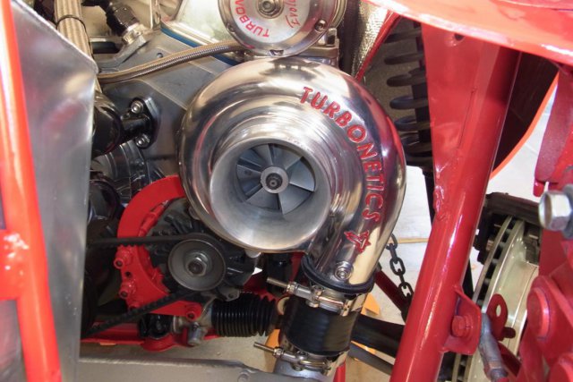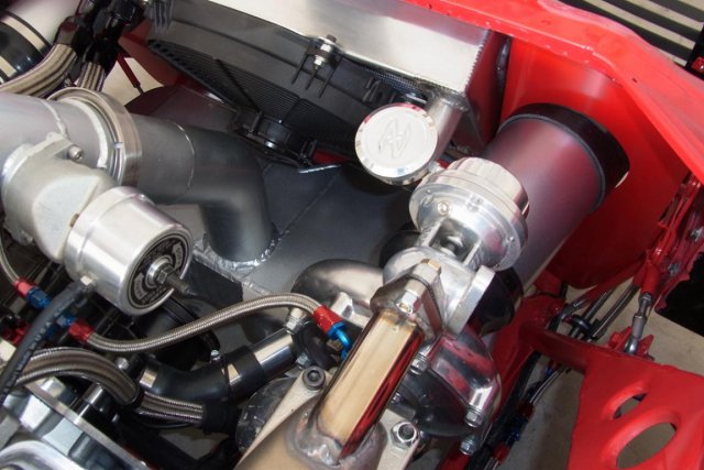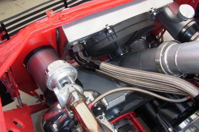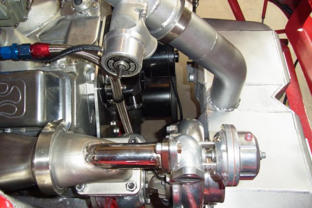 The turbos, with Evolution Turbonetics waste-gates, have been attached to the headers and to the air-to-water inter-cooler. The 3 1/2" inter-cooler outlet is now connected to the Extreme Velocity carburetor hat. A Greddy blow-off-valve vents pressurized air when the throttle slams shut. -
