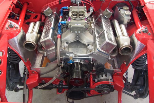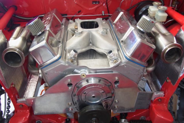 The block is a 4.125 bore Motown ll. The rotating assembly is a Speed-O-Motive crankshaft kit consisting of: 3.75" stroke 4340 crankshaft, H-beam 6.00" Eagle rods, and 8.8 compression JE ...2618 forged pistons. The Edelbrock Victor jr. cylinder heads contain: 2.08" intake and 1.60" exhaust valves, 1.55" double valve springs, and Competition Cams Magnum 1.5 roller rocker arms. The Chet Herbert solid roller cam has the following specifications: Intake duration is 242 @.050 and .580" lift, Exhaust duration is 248 @ .050 and .600" lift, Lobe separation angle is 114 degrees, and installed centerline is 110 degrees ( 4 advanced ), Valve lash is .018 intake and .020 exhaust. The Edelbrock Victor jr. intake manifold has had the thermostat housing removed and two AN-16 bungs were welded in place to route coolant to the radiator via stainless steel braided hoses. -