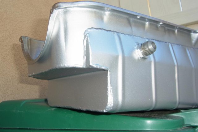 Engine and transmission is going in. Despite the modified cross-member, the Milodon Drag Race oil pan, #31145, would not clear. The pan comes with a windage tray and double trap doors. The tapered sump measures 6" in front and 7 5/8" in rear. I removed the interference portion of the pan at the front to allow cross-member clearance. Mack, then expertly welded a piece of metal to the pan to seal the front end. This modification provided the necessary clearance. -