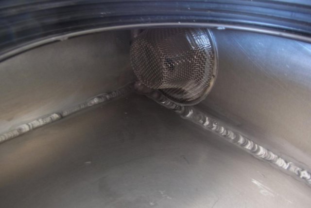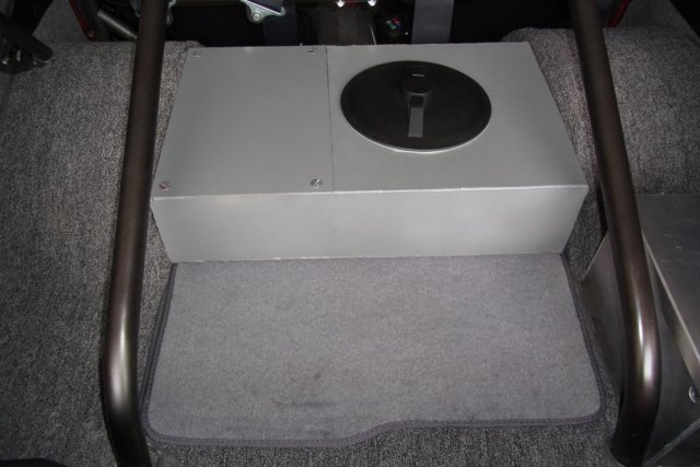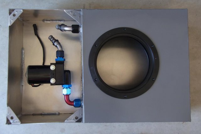 I designed and Mack fabricated this electric water-pump and 6 gallon ice-water combination tank for the air to water inter-cooler. A kitchen sink stainless steel screen strainer blocks the larger ice particles from entering the 25 gpm Meziere pump. The tank fits securely and snugly between the Z's wheel tubs. -