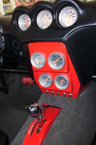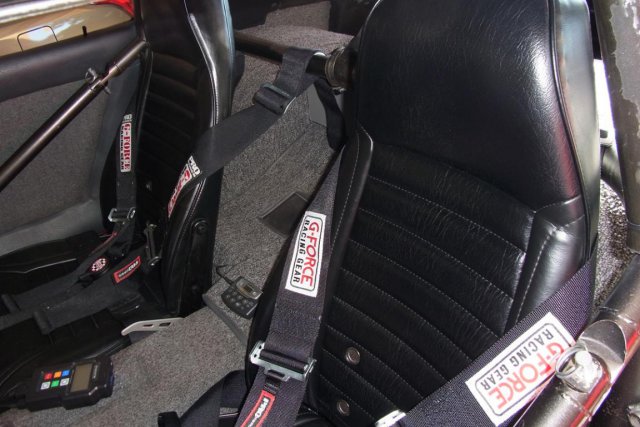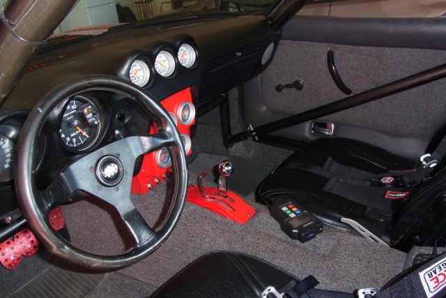 The interior shows stock 240 Z seats and G-Force racing harness. The B&M shifter housing was recessed into the transmission tunnel. The gauges and electrical switches were installed into a custom dash panel. -