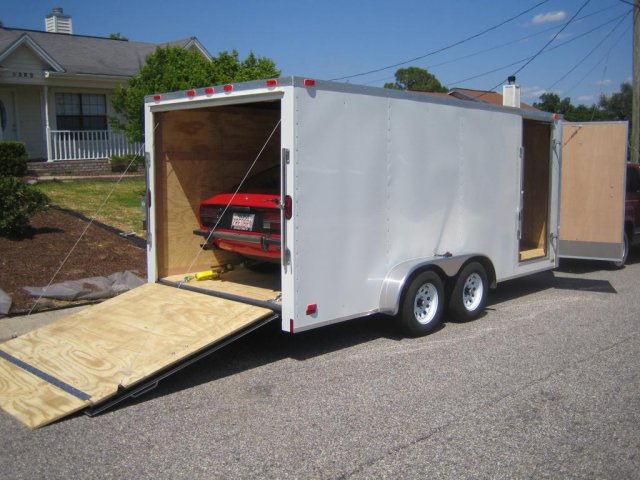 I'm surprised more people haven't mentioned enclosed trailers. I bought mine in '06 and it's still in great shape. Continental Cargo brand, not the greatest but just fine after 8 years. The trailer with my Z in it weighs under 4200 lbs actual. 16'x7' (narrow clearance but it fits if you're skinny like me and can weasel through a barely open door). [EDIT -- I thought an enclosed trailer for under 2000# was pretty light. This trailer hauls just fine, though I do use a weight-distribution hitch to help out my old Chevy pickup a bit. Highly recommend one to everyone hauling their car, no matter what the trailer. Hauls nicely!] My next enclosed trailer will be 8' wide... the narrow clearance wasn't worth the savings in trailer cost in retrospect. I also won't get a v-nose next time. The aerodynamic / hauling mpg benefits are negligible. I'd rather have the extra real estate inside the trailer. Evidently I've only ever taken a picture of it when it was new:
